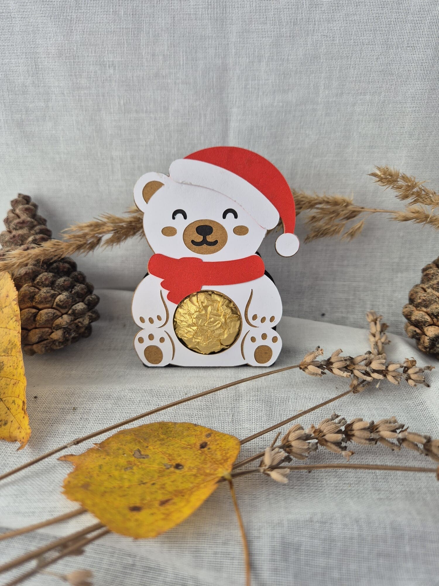 Eisbär Verpackung für Schokoladen-Praline. Dieser kleine Eisbär ist zum Gestalten als Weihnachtstischdeko, süß anzusehen oder Gastgeschenk, Wichtelgeschenk, Geschenkidee für Weihnachten, Kleinigkeit, kleines Mitbringsel, für Kollegen, Freunde, oder als Kleines Dankeschön